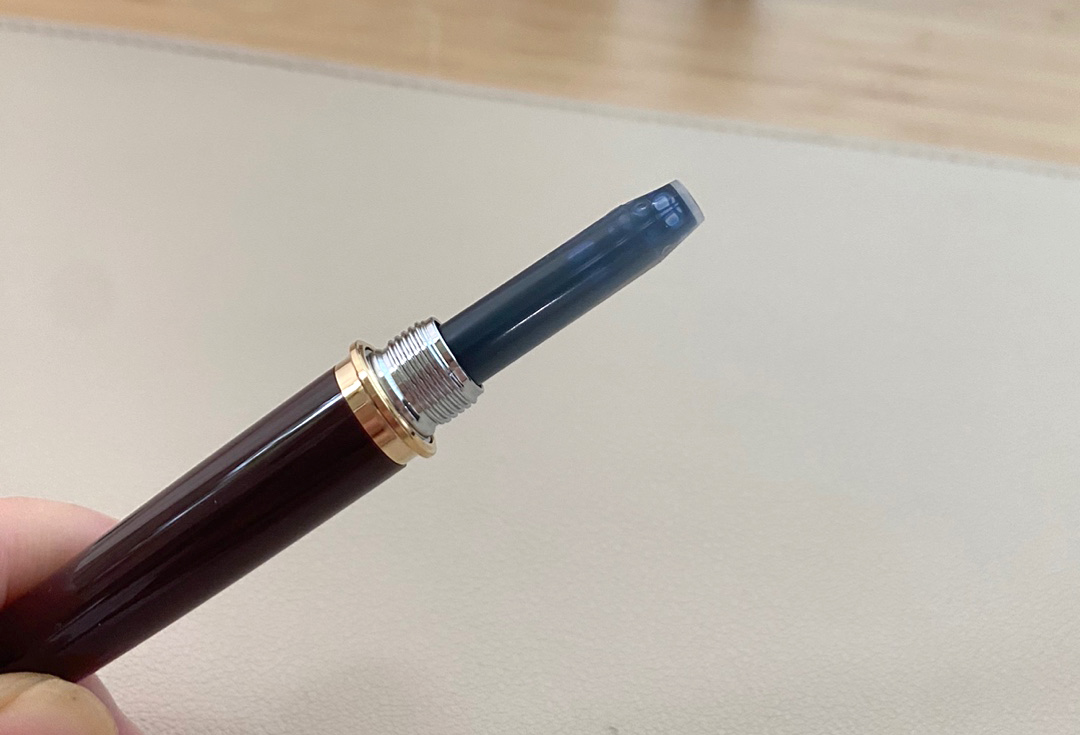 또한 이 만년필의 특징 중 하나가 바로 세미 후드닙인데, 촉을 베럴이 살짝 덮은 형태라서 일반적인 후드닙보다는 덜 감춰져 있어요. 이 때문에 더 독특한 인상을 주고, 필기감도 그 특유의 감촉이 있어서 유니크한 매력이 느껴지는 것 같아요.