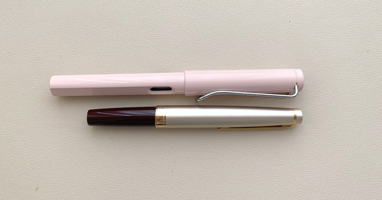 비교를 위해 파이롯트 엘리트 만년필과 라미 사파리 만년필을 함께 놓은 사진을 첨부했어요. 두 제품의 크기 차이가 확실히 느껴지실 거예요. 특히 엘리트는 정말 작고 아담해서 주머니에 넣어도 눈에 띄지 않을 정도로 귀여운 사이즈입니다.